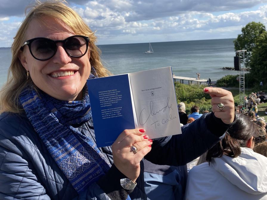 Da interviewet kom i gang, vendte stemmen heldigvis langsomt tilbage, og den veloplagte Chimamanda skuffede ikke. Hun var akkurat så charmerende, indsigtsfuld, vittig, kompromisløs og skarp, som forventet, og den nigeriansk-amerikanske forfatter fik gang på gang publikum til at skraldgrine og udbryde i spontane klapsalver. De 60 minutter fløj afsted, og bagefter kunne de fremmødte fans stille sig i kø til at få en autograf. Her var Cecilie på pletten med sin medbragte udgave af "Brev fra en nybagt forælder", der fik en fin hilsen fra forfatteren i kolofonen. Sikke en fantastisk dag, sikke en fantastisk forfatter.