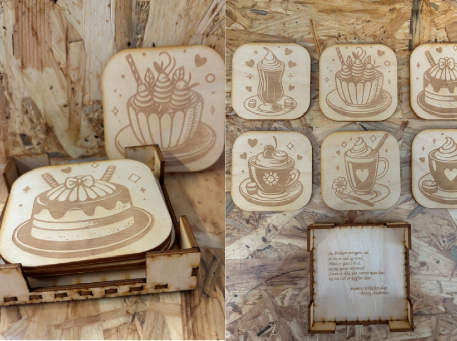 Til kaffe skal materialet kunne holde til høje temperaturer, og derfor var det sikreste valgat lave coastersne på vores birkefinér. De er lige nu ret modtagelige for fugt, og derfor overvejer vi at oliebehandle eller lakere dem for at gøre dem ekstra holdbare.